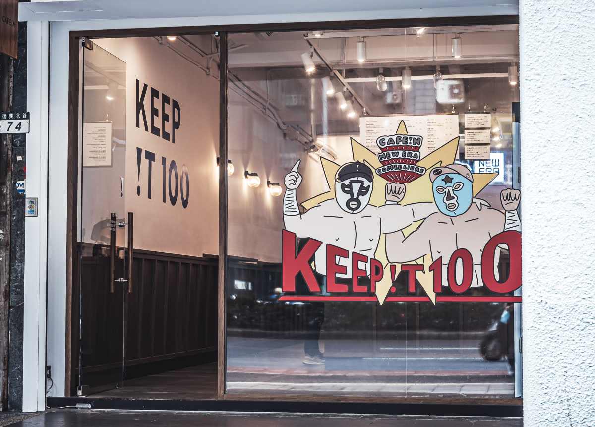 NEW ERA百年特展就選在CAFE!N復北店展開,白色的三層樓店裝,結合NEW ERA與CAFE!N的品牌標誌,呈顯簡約的俐落感,門口的大片落地窗上就是展覽合作的漫畫家Abei以COFFEE LIBRE的摔角手Logo為這次三方聯名設計主視覺。