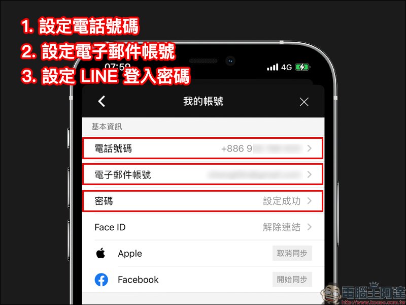 在我的帳號的基本資訊下方,依序確認「電話號碼」、「電子郵件帳號」和「密碼」都有設定妥當。