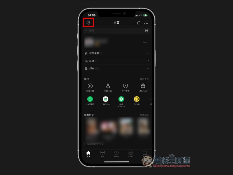 首先,在 LINE 主頁點選上方的「設定」(齒輪按鈕):