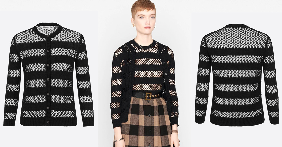 這件Dior款是不是跟你印象中的很“端莊”的開襟外套設計很不一樣呢?黑色全棉開襟羊毛衫採用經典的剪裁,並以透氣的漁網及平織布作為面料,撞色條紋加上珍珠母鈕釦點綴,可套在簡單的 T 恤上展現活力,又或是穿上同款黑色網眼布上衣營造出若無的神秘感,動靜皆宜。