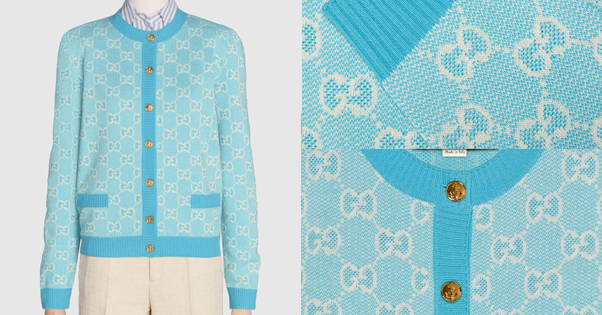 按照Gucci現今的品牌風格走向,開襟外套的設計絕對是眾多品牌中最有趣的款式之一,像這件採用天空藍色和白色羊毛混紡棉製作而成的開襟衫,整體設計呈現淡雅色彩,並以標致性的GG提花圖案為亮點,圓領和修身的廓形,也為這件針織服注入一絲宛如奧黛麗赫本式的優雅氣息;而金色船錨造形的金屬鈕釦細節亦令整體廓形充滿航海風格。
