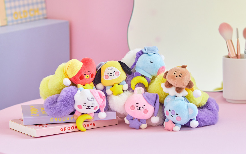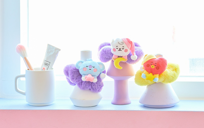 再來是女孩們都會用到的「髮圈」,不但以舒服的毛絨材質製成,更搭配了七隻BT21的睡夢造型!除了戴睡帽、穿睡衣,還讓BT21手拿星星、月亮及白雲等象徵夢境的元素,平時放在桌上看起來完全就是小娃娃的感覺阿~