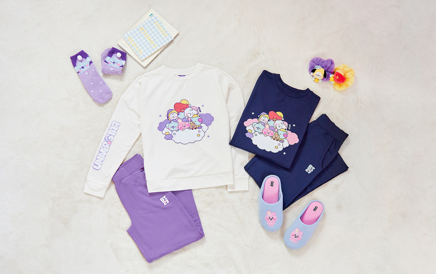 「居家服SET」則是在素面的長袖T上印有BT21們香甜地睡在雲端上的造型,有深藍色及白色可以選購~而搭配的長褲分別是深藍色及紫色,只有在口袋附近印上了「BT21」的圖案,低調又舒服,待在家耍廢最適合穿了!