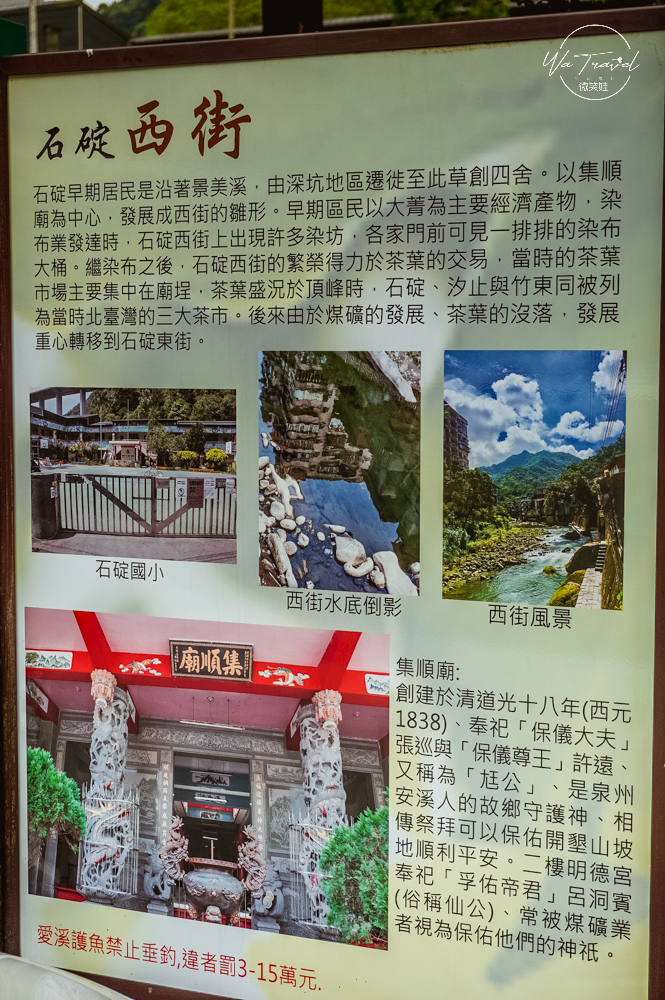 望著背向高架橋繼續走一邊通往東街是石碇老街,對面橋走過去是通往淡蘭藝文館、石碇國小、淡蘭古道!穿越過橋後就是「石碇西街」,石碇西街上有1838年建立的集順廟,過去還有許多染坊跟茶葉市集,非常熱鬧。不過隨著時代變遷沒落後,西街很多房子改建後反變成一般民宅,要通往淡蘭古道也是要往這方向走而非老街的東街!