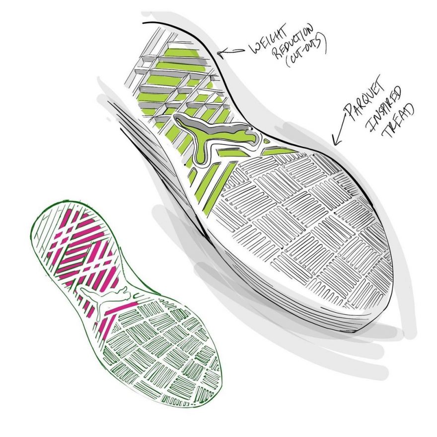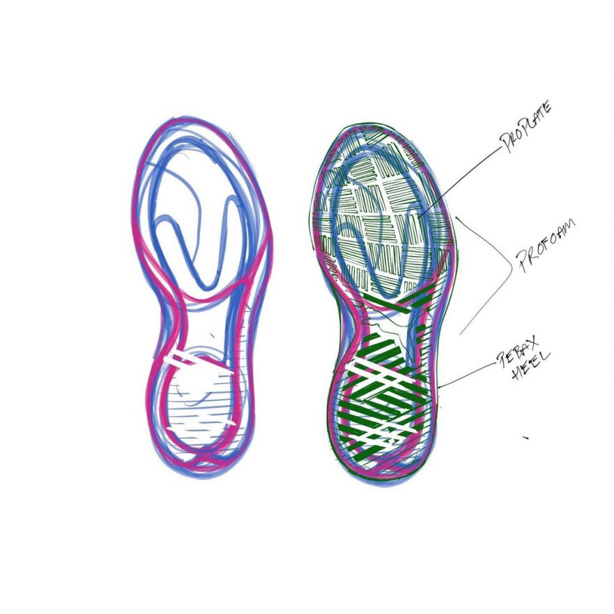 關於底盤的科技配置編輯想引用 PUMA Basketball 設計總監 Jeremy Sallee 的圖稿來說明,下方左圖可以清楚看到 ProFoam、Pebax 兩種避震材料以及 ProPlate 穩定片的分佈位置,近年來產業界又再掀起另一波中底發泡材的軍備競賽,由 Pebax 作為成份的科技真是有著不少戲份,在各家所調配的密度、配方下形成百花齊放的局面,Clyde All-Pro 屬於新鞋上腳不需要熱開就能踩出回彈感的型態,與 ProFoam 應用在籃球鞋上多半較為紮實偏韌的調性互補,Pebax 位居後跟給予推進爆發力,ProFoam 則在中前段擔綱流暢引導力量的任務。