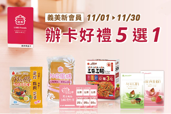活動期間內,申辦義美會員卡,享辦卡禮5選1:熱美式咖啡(中杯)兌換券、義美NG蛋糕(2個/組)、奶香鬆餅(3包/組)、三醬三麵拉麵三吃或IMEI- Premium抹茶/草莓仁巧克球(2包/組)。