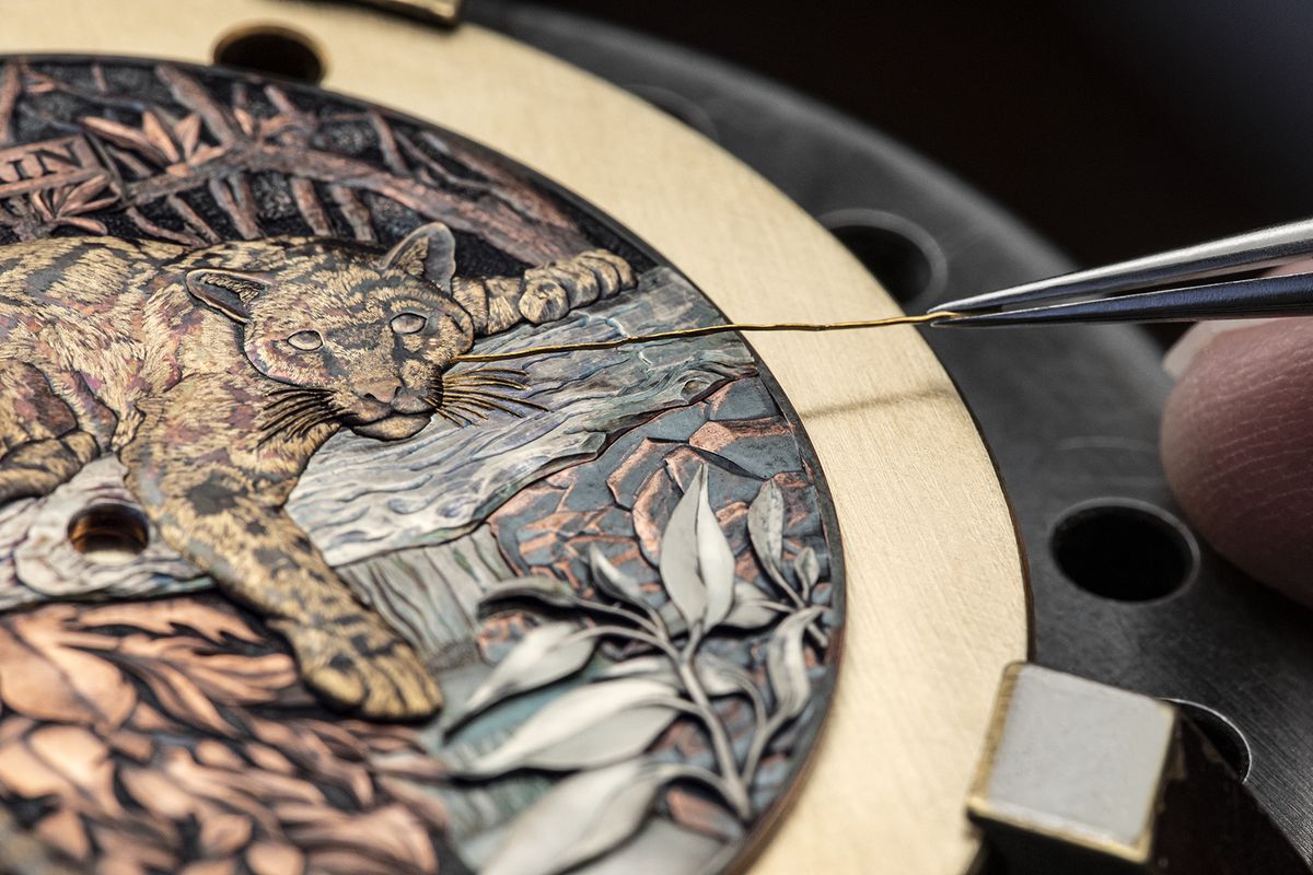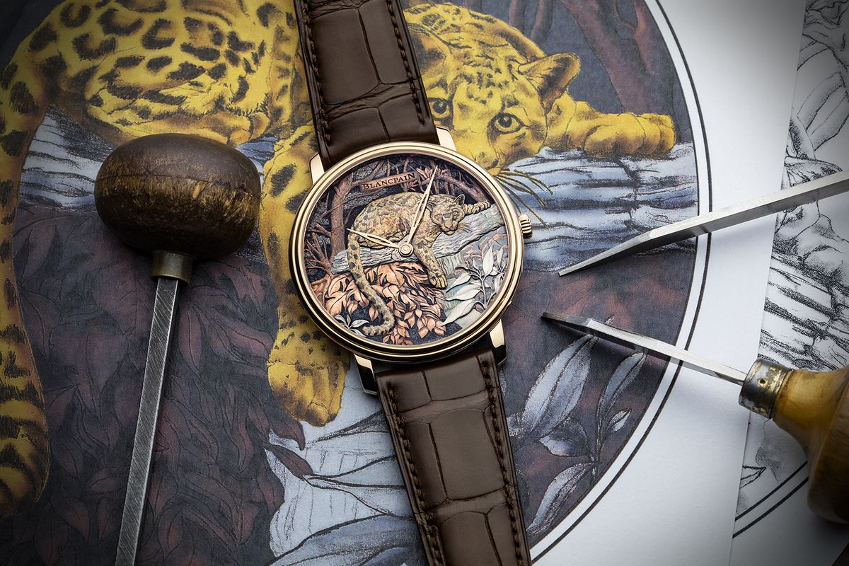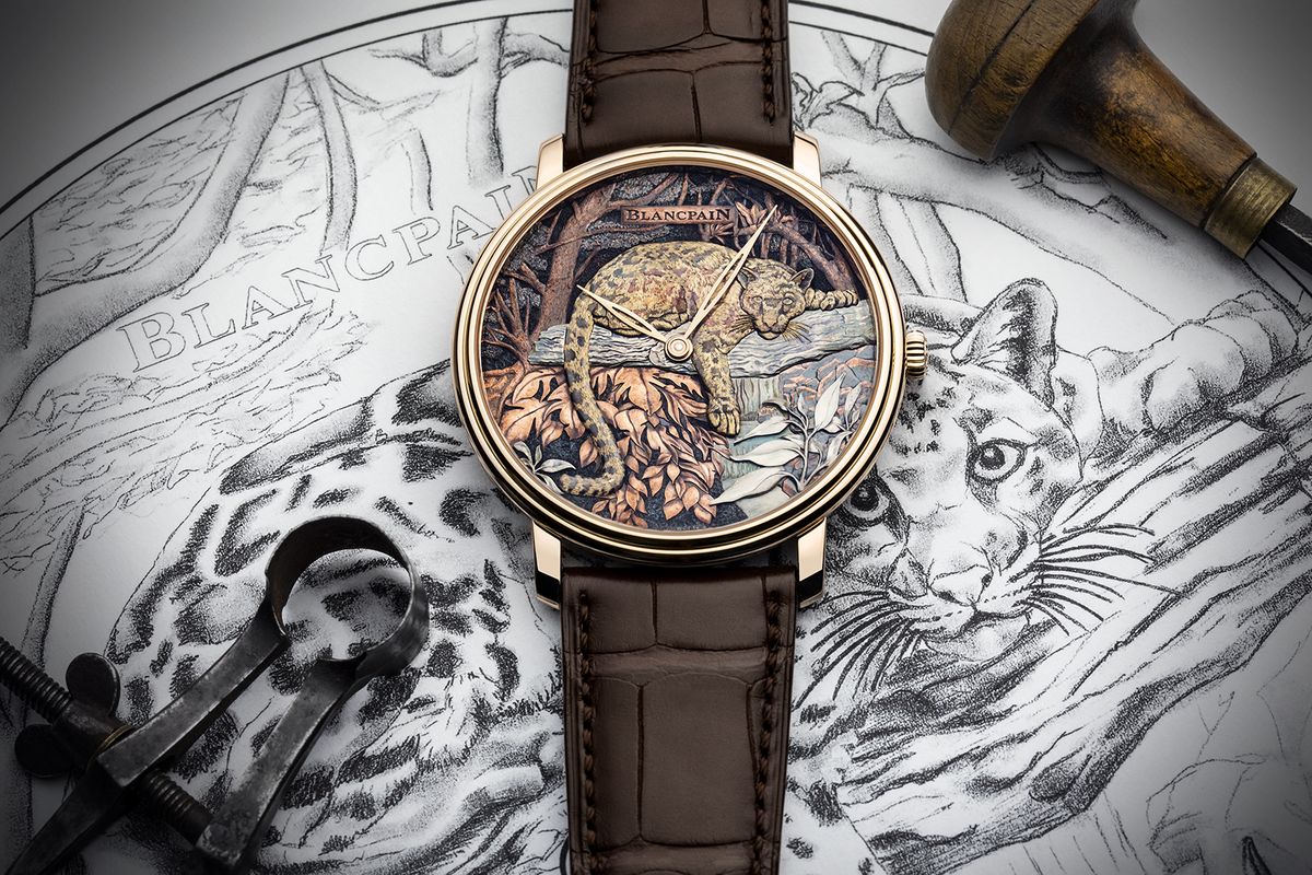 每款設計都是唯一,如同「雲豹」一般,從紙上草圖描繪背景紋飾與姿態開始,運用精密工具,以手工雕刻金色貼花將雲豹及週邊山林細節刀刀刻畫出,為了達到如雲般的豹紋色彩,以赤銅工藝黃褐色的表面展現其雲狀斑點,極其逼真。再以大馬士革鑲金工藝將黃金絲線敲打進錶盤細膩地逐一嵌入金線製成,細緻的毛髮絲絲入扣引人入勝!此款雲豹作品結合古老的大馬士革鑲金、金雕、赤銅工藝,突顯BLANCPAIN大藝術家工坊在製錶領域的獨特性,並以45毫米紅金錶殼裝載;透明背蓋以備受高裝飾性錶款青睞的藍寶石水晶製作錶底蓋。搭配15B手動上鏈機芯,上方飾有「日內瓦波紋」面盤飾紋,更顯極致藝術工藝的表現。