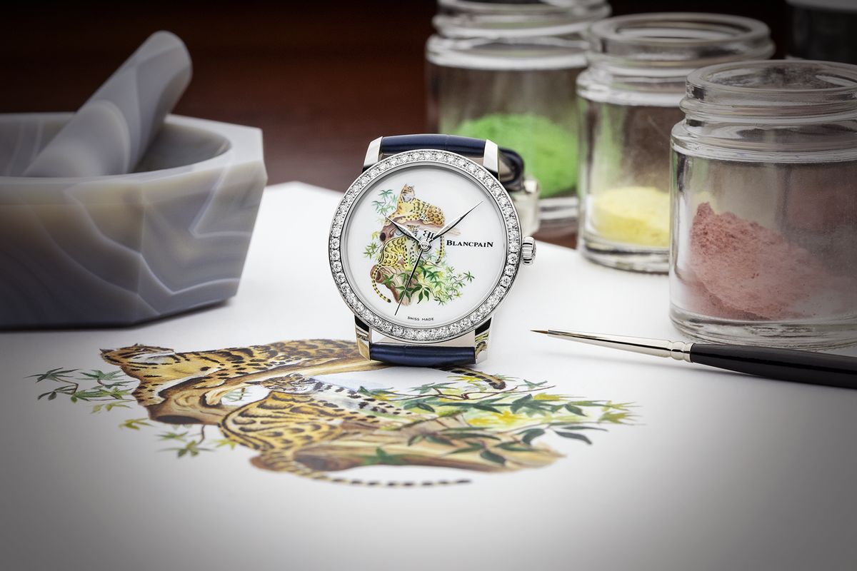 錶盤上的雲豹在工藝師的巧手下顯得生氣靈動,展現完美融合美學與工藝的感動。陶瓷上的雲豹琺瑯彩繪安置在33.2毫米的白金錶殼中並以鑲鑽錶圈環繞,搭載錶廠獨家的自動上鏈Cal.1154機芯,其一絲不茍的精密加工透過時計的鏤空錶背一覽無遺。此錶款的微繪琺瑯工藝是BLANCPAIN工藝師在Le Brassus錶廠裡進行的眾多琺瑯技術其中的一項。首先由石英、長石和高嶺土的粉末組成的陶瓷來製作彩繪錶面,一開始加水稀釋並將漿料過篩及多次過濾,去除所有殘留物和雜質,最後澆鑄在錶盤模具中。從模具脫模後乾燥24小時,再以1,000°C高溫燒製24小時讓錶盤硬化。工匠接著將琺瑯釉彩填入每個錶盤,再於1,300°C高溫下二次燒結持續24小時,使得釉彩玻璃化,形成發亮、透明並能持久穩定的錶面。接著以琺瑯粉為主的配方與松油混合,工藝師會自行製作專屬的調色盤與源自BLANCPAIN配製的特殊配方,以展現獨特細膩的色彩變化。完成繪畫後必須再次置於1,200°C的烤箱中燒製;錶盤上進行微繪琺瑯的過程十分繁複,因此,造就每個錶盤都是世界獨一的款式。nbsp;