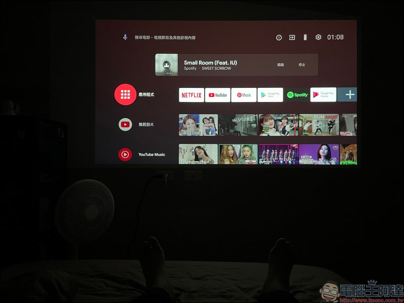 筆者躺在床上翻拍峰米 Dice 真無線智慧投影機投影的畫面,顏色和清晰度表現都相當好: