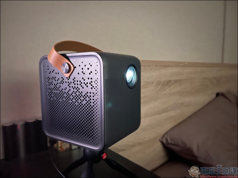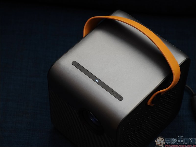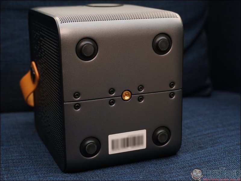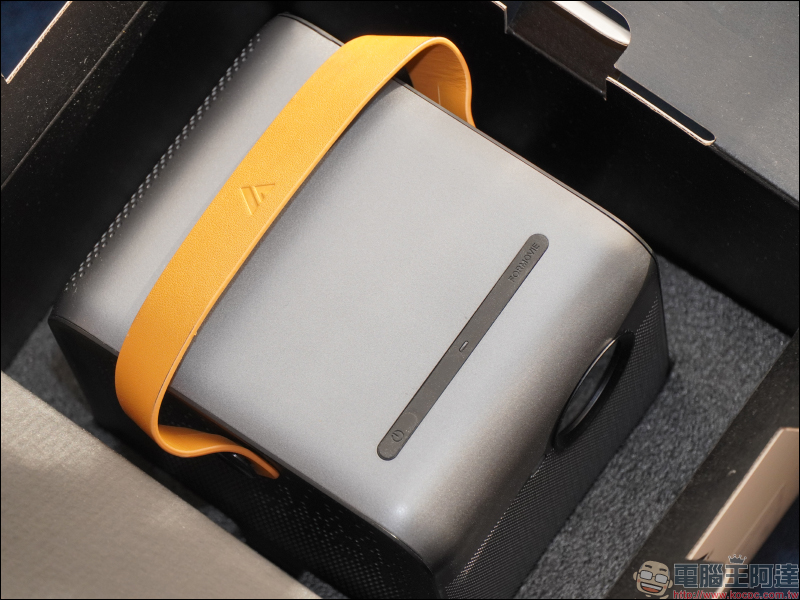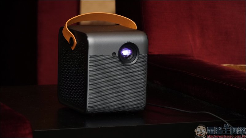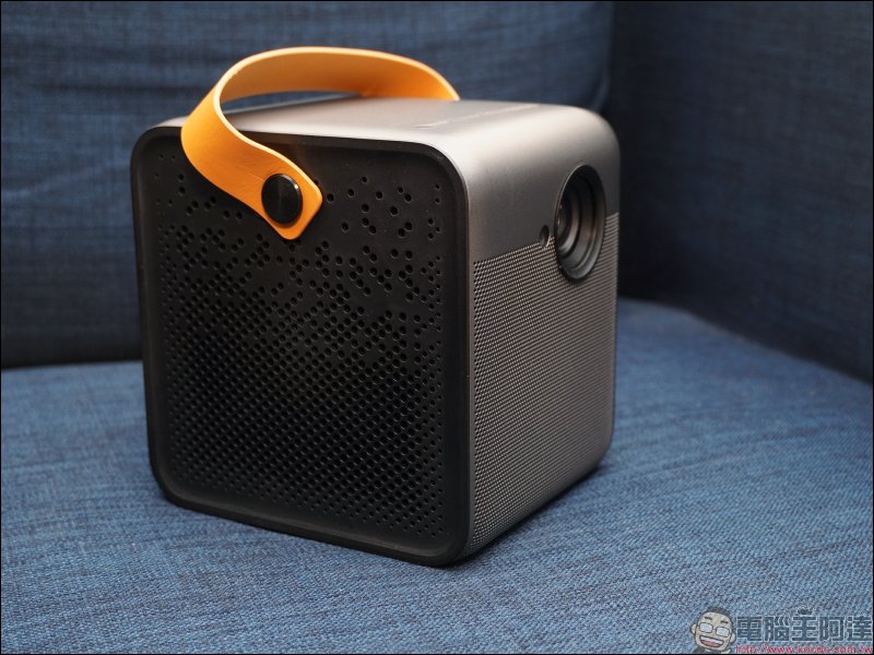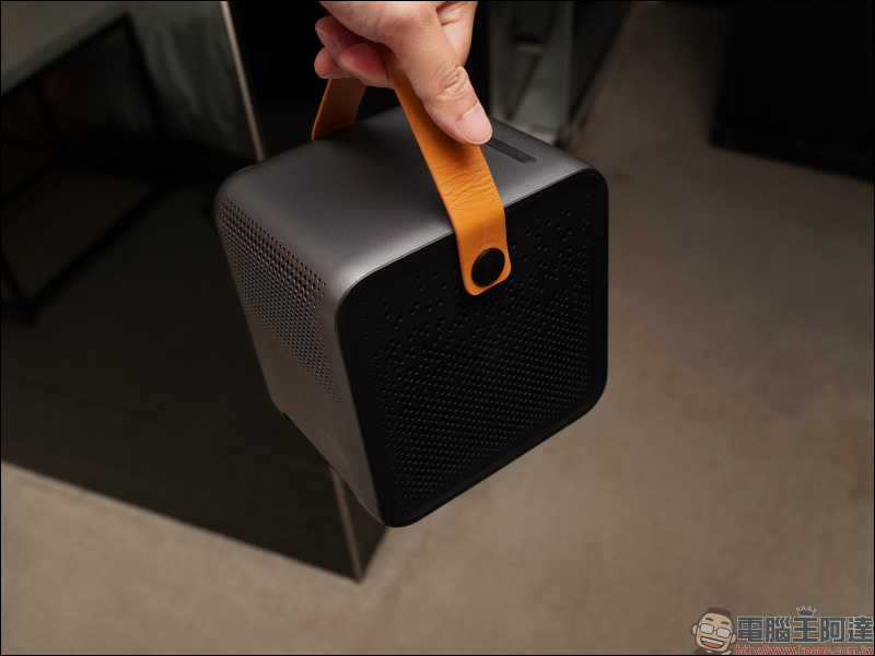 首先看到峰米 Dice 真無線智慧投影機的外觀部分,採用霧面深灰色外殼的立方體造型機身設計,對於外出收納或融入居家擺設顯得相當容易。機身上備有皮質提把,不僅對於攜帶更輕鬆也同時讓整體質感大幅加分!