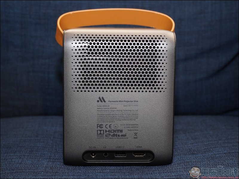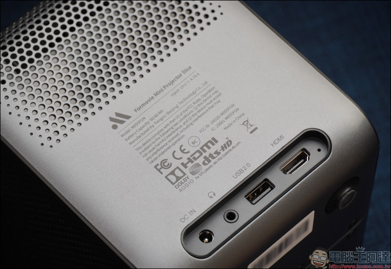 峰米 Dice 真無線智慧投影機在機身後方的連接埠包含充電孔、3.5mm 音源恐、 USB 2.0 以及 HDMI 接口。用戶除了可透過內建的 Android TV 使用各項 Android 應用程式,也可藉由 HDMI 連接電腦、平板或 Switch 等設備。