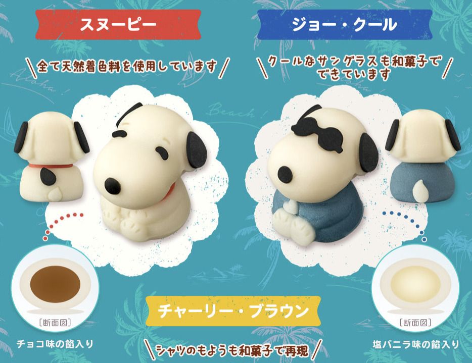 可以吃的吉祥物「食べマス」系列,總是推出各種不同人物造型的和菓子,這次主角輪到會讓史努比迷瘋狂的「Peanuts和菓子」登場!有三款角色化身成和菓子:Snoopy、Joe Cool以及查理布朗,三款造型都非常細緻的呈現出細節,加上都是坐著的姿勢,看起來一小團的樣子,又可愛又療癒~