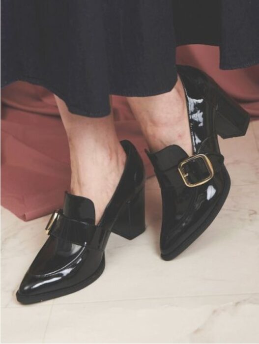 如果不想搭配一般高跟鞋以免看起來太強勢,選擇這種好駕馭的樂福鞋吧!這不只是一般的樂福鞋,它的跟更高一些,所以身材比例也會跟著拉長。