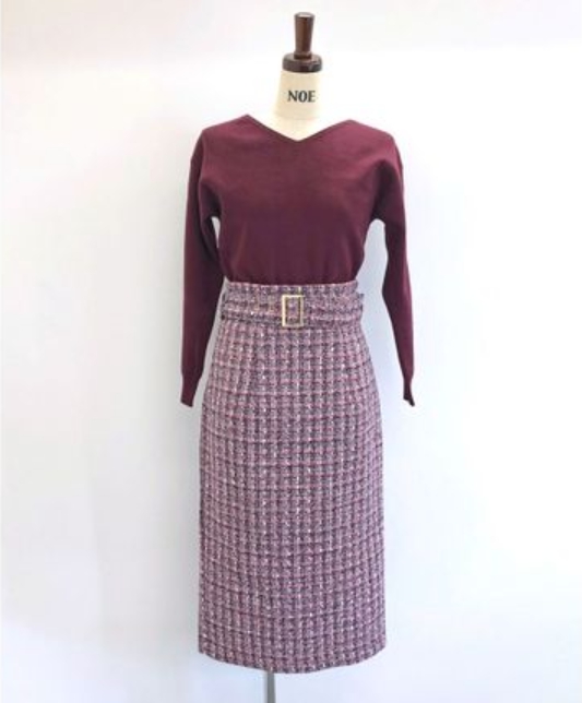 下身推薦同色系的毛呢長裙,粉紫色的毛呢是溫柔的秋冬感,高腰長裙巧妙的藏住你的小肚肉。
