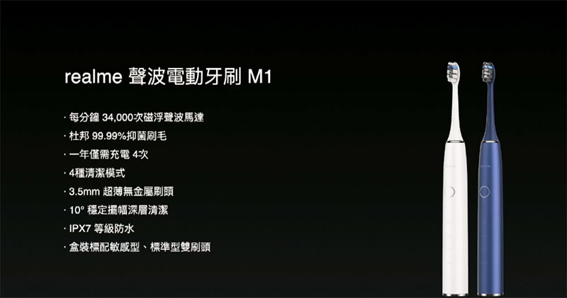 realme 聲波電動牙刷 M1 推出白、藍雙色,售價新台幣 999 元,於 11/26 於 realme 網路商店、realme 品牌專櫃、momo 購物網、PChome 24h 購物、Yahoo 奇摩購物中心及蝦皮商城正式開賣。首賣日優惠現折 111 元,再加贈原廠刷頭(3 入,市價 299 元)。