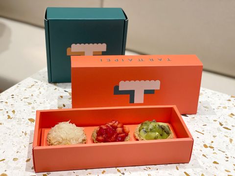 外帶盒設計結合店內色彩元素,提供3入盒裝酥塔禮盒▼