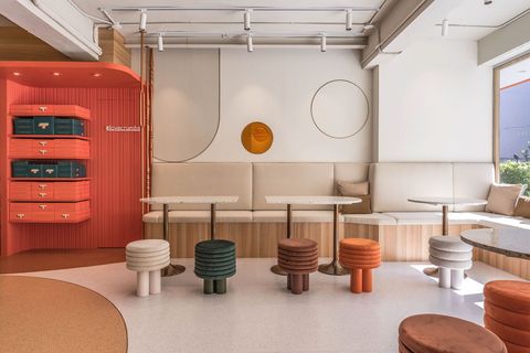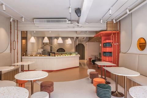 店內結合彎曲線條與充滿趣味感的訂製造型椅,呈現甜點店的可愛柔美意象,無論是來店享用下午茶、或購買酥塔作為伴手禮,都讓人覺得感染到開心明亮的氣息!