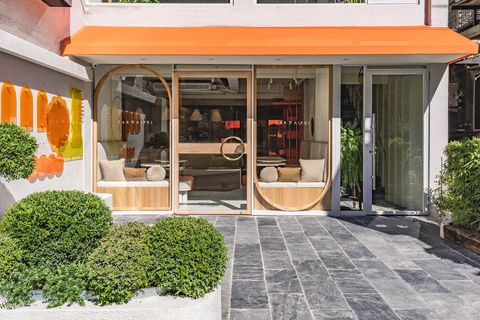 TART TAIPEI整體空間靈感來自圓形蛋塔,延續包裝的艷陽橘與墨綠,利用品牌橘色系透明壓克力,與各式圓型、弧型演繹90年代摩登趣味普普風。