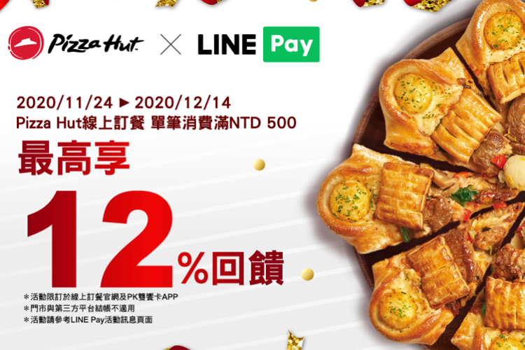 活動期間,已註冊LINE Pay的用戶於Pizza Hut線上訂餐消費,並於網站上透過LINE Pay付款完成結帳且單筆實際付款金額滿NT$500元(LINE POINTS點數折抵金額不計入),可享以下優惠: