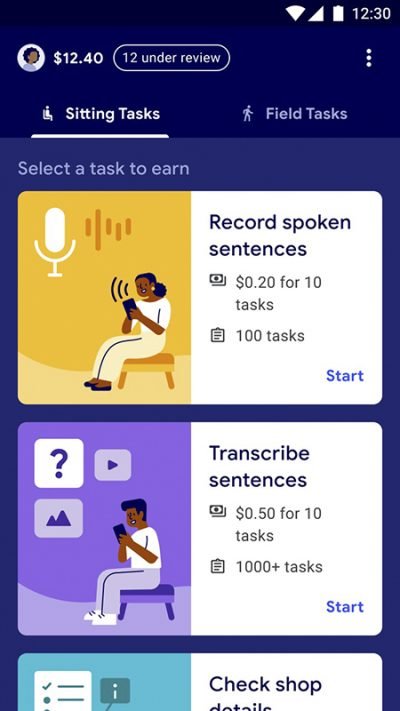 舉例來講,就 Task Mate 在 Google Play(目前限定印度與肯亞)的截圖資訊來看。他們就列出了 Google Maps 在地嚮導應該不會太陌生的項目,像是拍攝店面照片與確認商店詳細資訊等「外出任務(Field Tasks)」,與可能與 Google 機器學習相關的則是有錄製特定詞句的語音、確認翻譯品質、回答問券及改寫詞句等,坐在原地拿著手機就可以執行的一般任務(Sitting Tasks)。