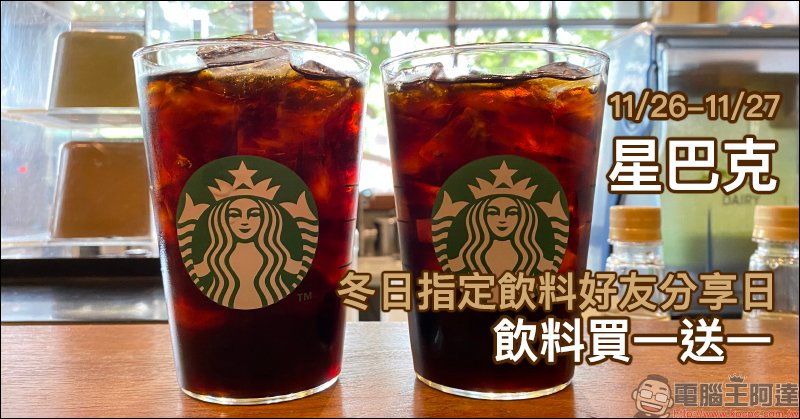 雖然今年的冬天比起往年相對沒那麼冷,不過星巴克依然將在 11 月 26 日與 11 月 27 日這兩天推出「冬日指定飲料好友分享日」的飲料買一送一活動啦!消費只要在這兩天指定時段內前往參與活動之星巴克門市,即可享有飲料買一送一的優惠。不過這次的買一送一除了罐裝飲料、典藏系列咖啡、手沖、虹吸式咖啡及含酒精飲料不適用,耶誕季節飲品也不在買一送一的優惠範圍內哦!