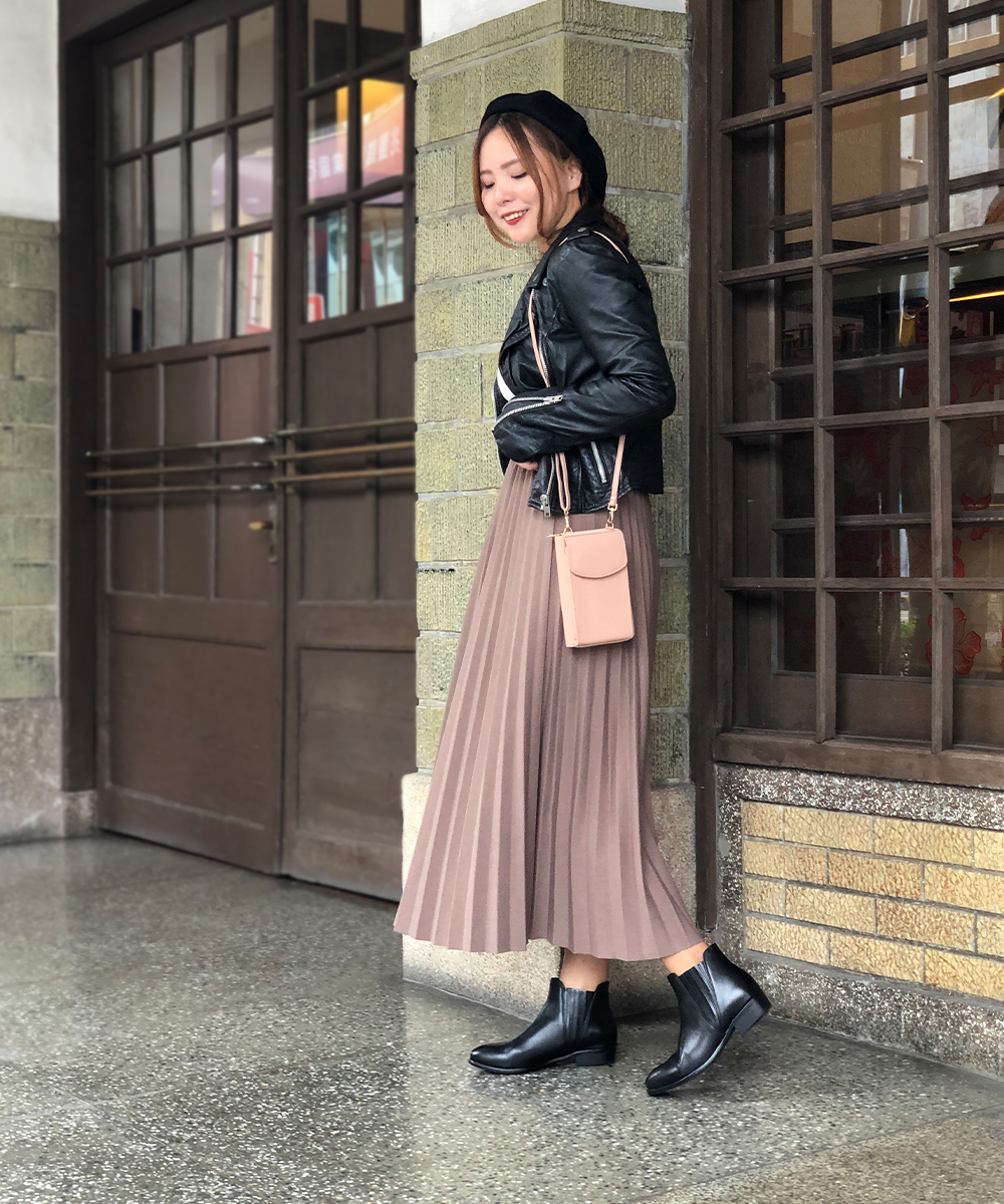 加上一件也是秋冬必備的「皮外套」