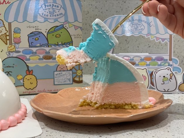 「白熊冰淇淋派對」冰淇淋蛋糕打造環繞式180度立體造型,基底使用「藍色棉花糖冰淇淋」,並拌入Q彈小麻糬,搭配草莓冰淇淋佐海綿蛋糕,外觀顏色看起來繽紛之餘,切面的天空藍和粉嫩色更是夢幻,口感更是達到多層次感!