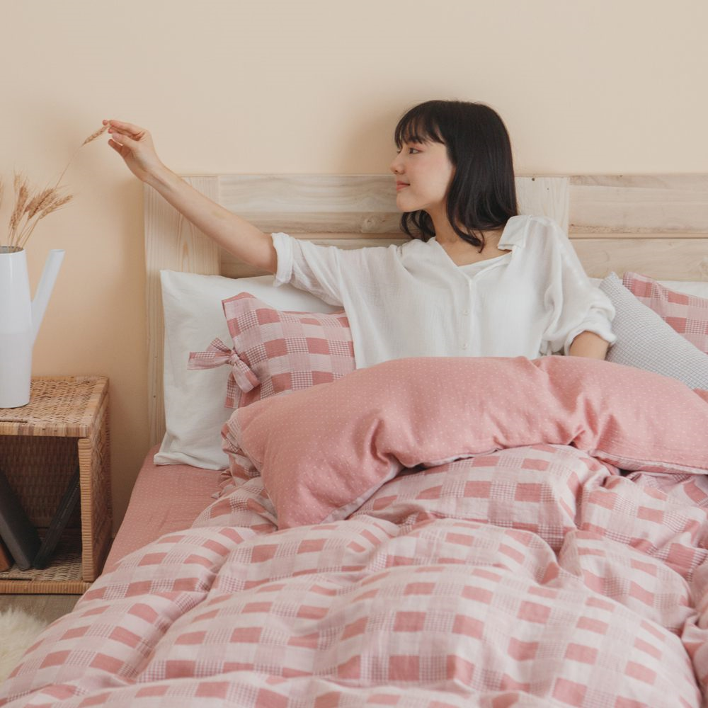 翔仔居家的這款長絨棉櫻花粉床包組,採用棉花纖維最長的長絨棉,再用雙層紗布織造法製造出比起一般布面更加輕盈、鬆軟的床包組。親膚的寢具組,對於敏感肌、細皮嫩肉的Baby來說是最好的觸感囉~ 被套一面是素色,一面是百看不厭的方格,想蓋哪面都隨心所欲~