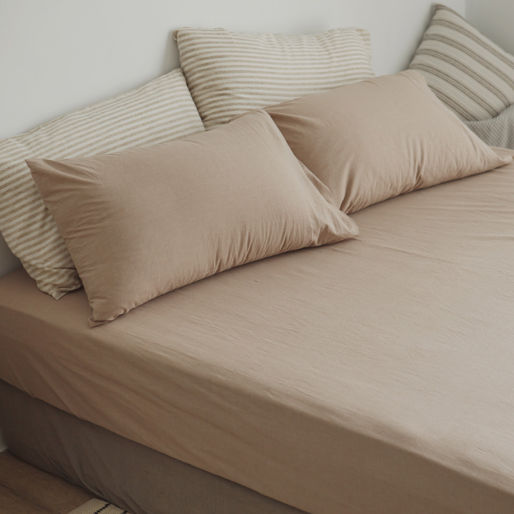 水洗棉屬於機織棉,是以紗線做為經緯線,交織成床包。因為經緯線交疊的緊密度特性,水洗棉的床包觸感平滑柔順,也較有韌性。