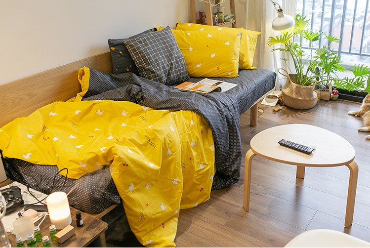 童趣風的黃金小海鷗床包,是AB面設計,一面是金色陽光、小海鷗圖騰,另一面則是藍底白點點。藍黃的跳色搭配,讓室內多了些活潑動感。如果你也喜歡俏皮風家居,不妨參考它唷!