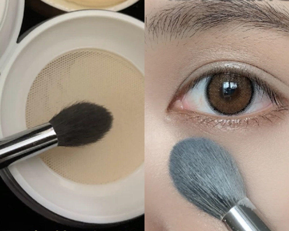 最後一步則使用霧面的蜜粉,搭配火苗型刷具,輕輕將蜜粉拍在眼下~所有的步驟都要注意的是,一定要用輕拍的方式上妝,因為眼下的遮瑕比較不容易固定,如果用推的、或是掃的,很容易毀掉剛上好的遮瑕。如果有淚溝問題的人,可以使用霧面淺膚色、或是霧面白色的打亮上在淚溝跟黑眼圈的邊界處,這樣就能在視覺上彌補淚溝的凹陷感!