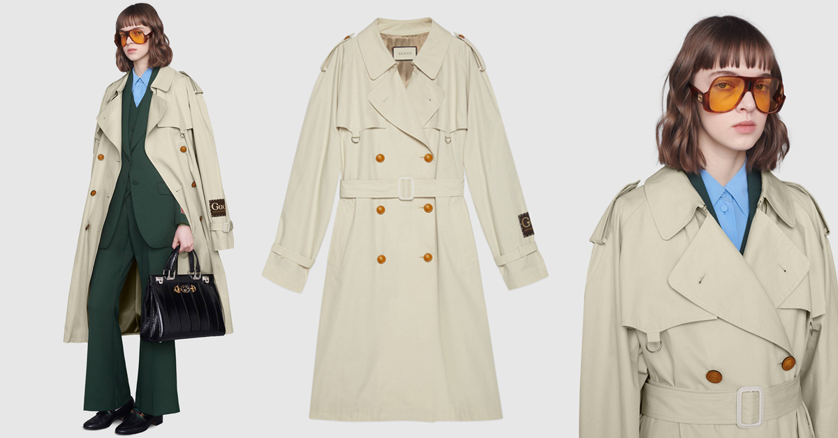 這件米白色風衣採用的是最經典氣質的雙排扣設計,融合流線造型和獨特細節,比如肩膀的落肩設計、衣釦上的浮雕圖案、袖口上「Gucci Quelle Qu'en Soit La Saison」的放大標籤,在在讓這件看似平凡的風衣增添小趣味。