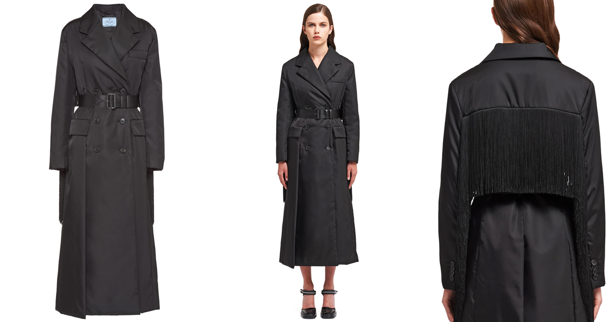 Prada雙排扣風衣材質特別採用回收海洋塑料所制成的創新性再生尼龍面料打造,正面看似正常簡約,一轉到背後不得了,過肩和衣袖的飄逸流蘇,行走之間大力甩出美麗的弧度,也甩出我們對時尚的自信態度!