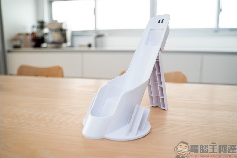 除了地刷以外,吸塵器、兩組毛刷都能放置上收納座上,體積不大放在家中較不容易占空間,同時有質感的設計,更為家中添增一份質感,不過這個充電座並沒有充電功能,要充電還是得拉一條 Type-C 才能充電: