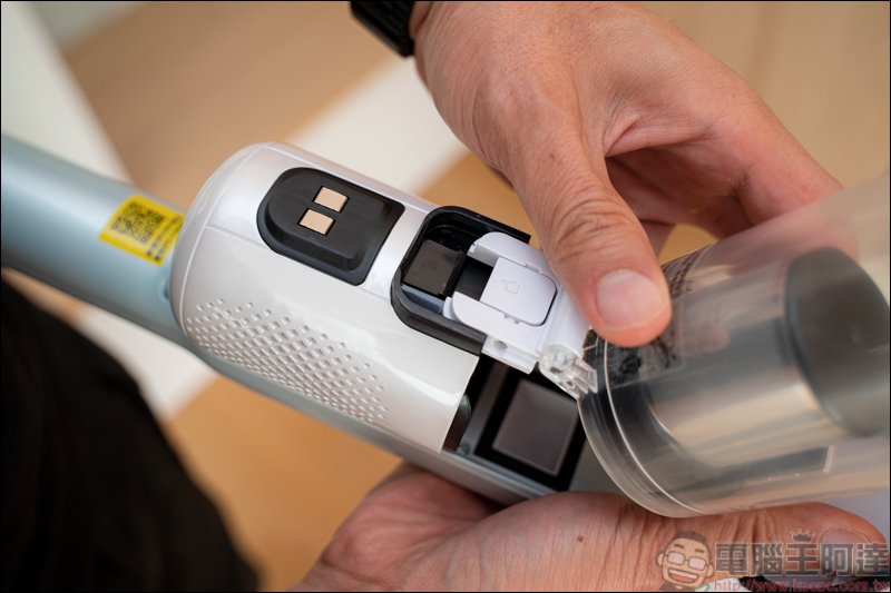 如果要取出集塵杯也很簡單,在靠近機上後方有個塵杯取出鈕,扳起來往前推即可: