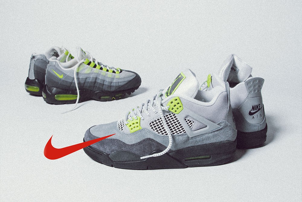 如果你還不曉得的話,對,今年是 Air Max 95 問世 25 周年,Nike 借 Air Jordan IV 之身做出了 Air Max 95 ‘Neon’ 之神髓,顏色、面料、反光效果、鞋帶形狀有所呼應只是基本,編輯最讚賞的要屬後跟塑料片了,本來凸起的九塊格狀體改為凹陷,並且縮小 NIKE AIR 商標的比例,一切都是為了更像 Air Max 95 (大拇指)。