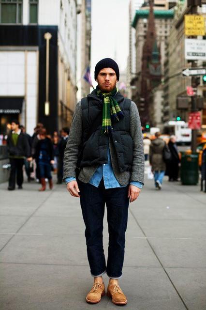 至於像以下這種以襯衫為主軸,內外添加衛衣或西裝外套的,則偏向於多層次的穿搭,是羽絨背心不可或缺的造型技巧,後面會再詳細介紹!