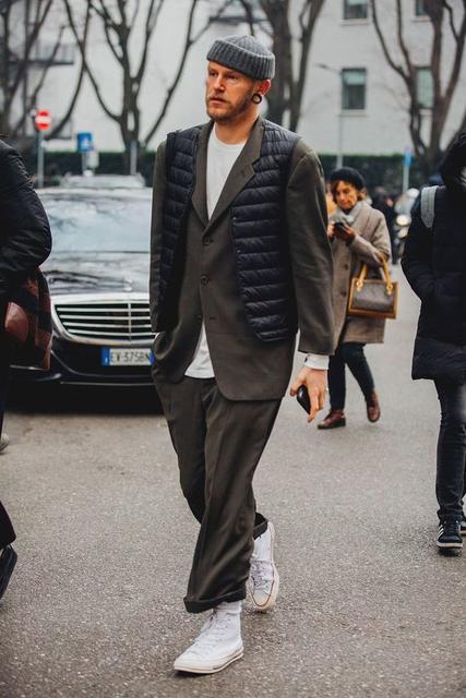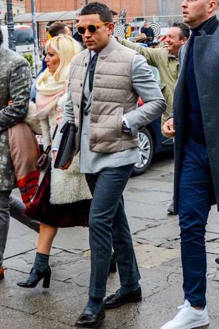 「羽絨背心+西裝外套」的搭法,在許多時裝周的場邊都能看見,特別是秋冬時節,成套的西裝外搭一件羽絨背心,不只保暖,同時也提升了造型的層次。選擇「同色系」的羽絨背心作搭配,能使整體穿搭更趨一致性,並具有畫龍點睛的功效。