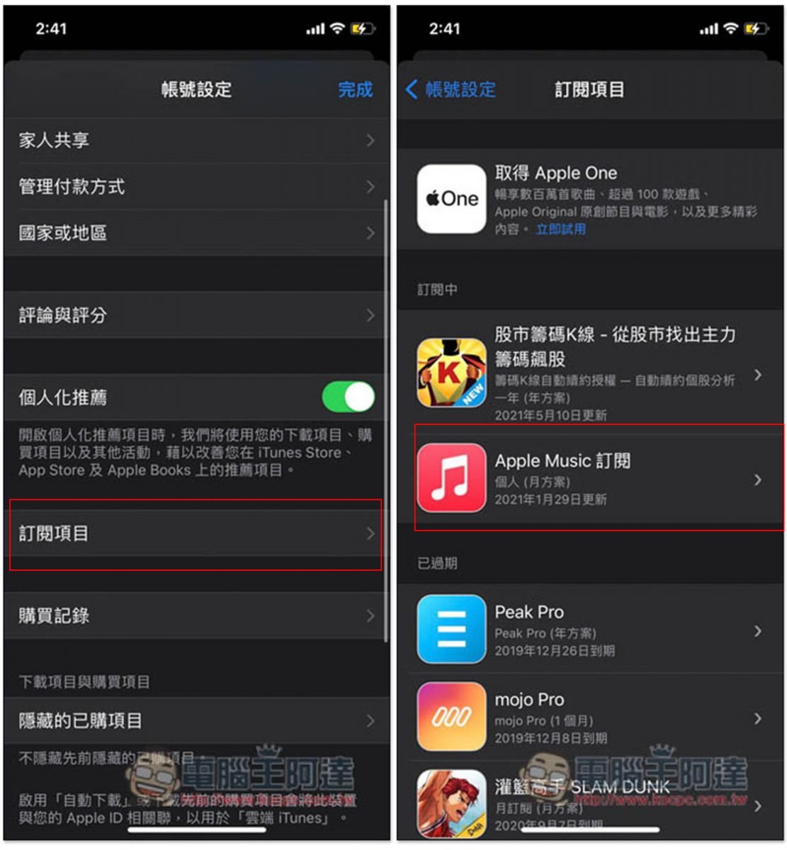 往下滑找到訂閱項目後,就會看到你目前 “訂閱中" 的所有服務,點擊 "Apple Music 訂閱":