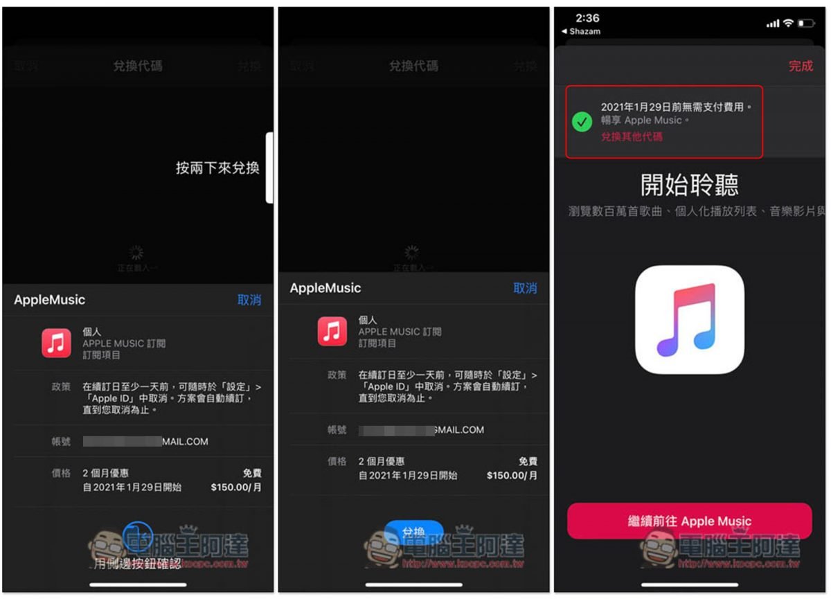 我這帳號以前有訂閱過 Apple Music,無法享有最初的 3 個月免費使用時間,因此只能兌換 2 個月,實測成功,畫面也會提示免費到什麼時候: