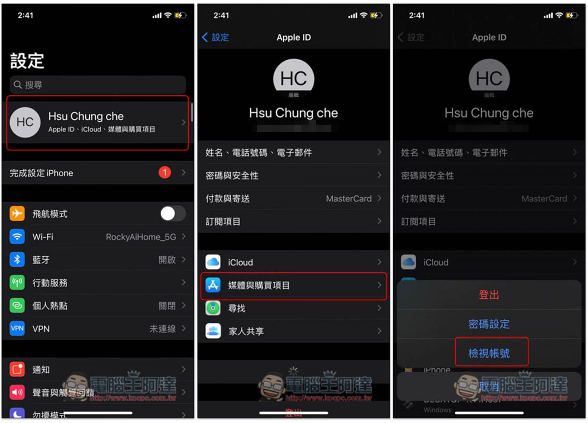 打開設定,點擊最上方的 Apple ID 資訊 -> 媒體與購買項目 -> 檢視帳號: