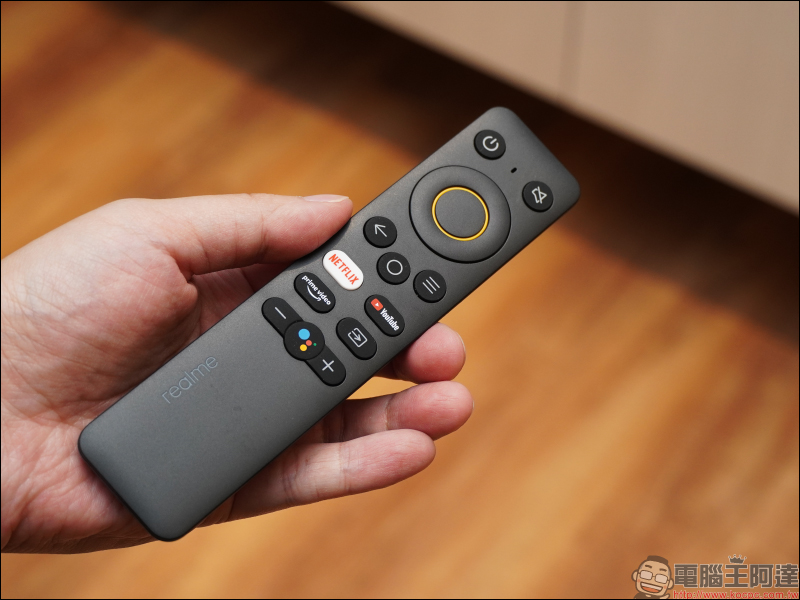 作為 realme 首批在台上市的智慧顯示器產品,我們也第一次親眼見到搭配的 realme 智慧遙控器。 realme 智慧遙控器除了可一鍵喚醒 Google 語音助理,也具備 Netflix 、 YouTube 、Amazon prime video 這些常見的 OTT 影音平台快捷鍵: