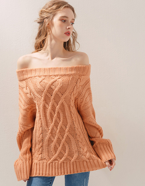 涼涼的冬天就是要穿上針織毛衣才保暖,不過包得緊緊的怕不夠辣嗎?可以選這件一字領麻花長袖毛衣喔~很溫柔的淡橘色相當襯膚色,細緻的編織圖騰也讓毛衣更有特色了。