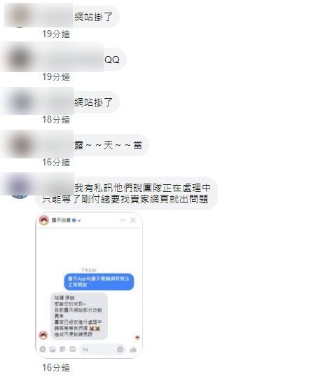 於「露天拍賣」粉絲專頁上也陸續有多人反映此一狀況,專頁小編也另外發文表示:「目前露天網站部分功能正在維修中」,修復時間與故障情況仍未知。