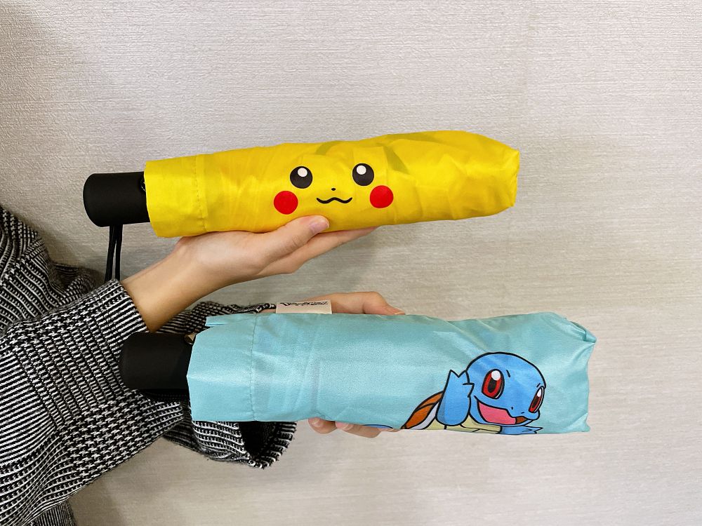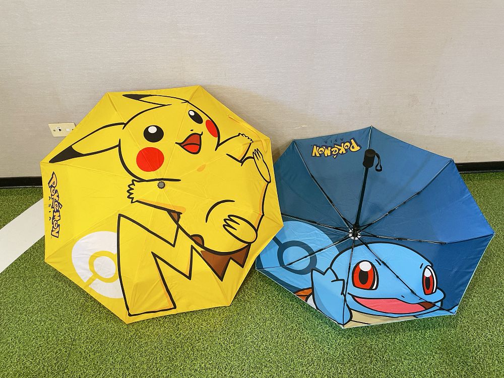 自動折疊傘以明亮的黃、藍為主色,皮卡丘在傘面賣萌,而傑尼龜則是藏身在傘內中,傘套則是以兩隻小可愛的臉龐為造型,雨天時就讓寶可夢為你遮風擋雨吧!