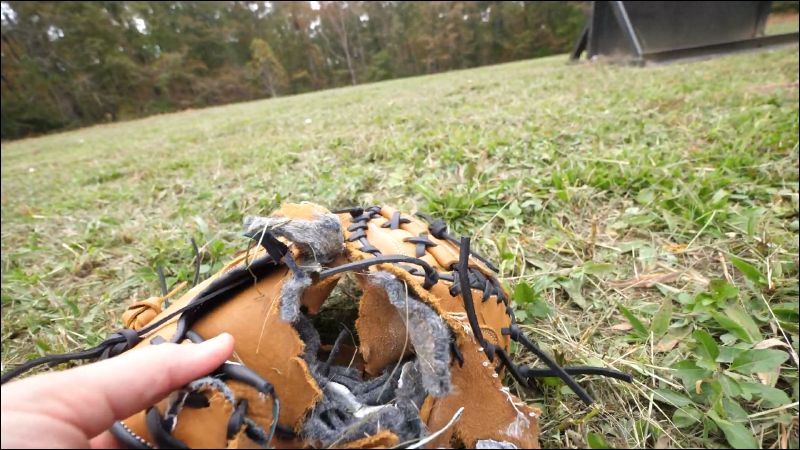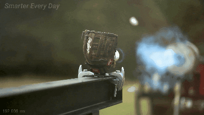 接著將手套架設在平台上,更容易看清楚棒球打穿的過程: