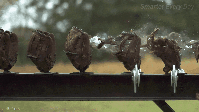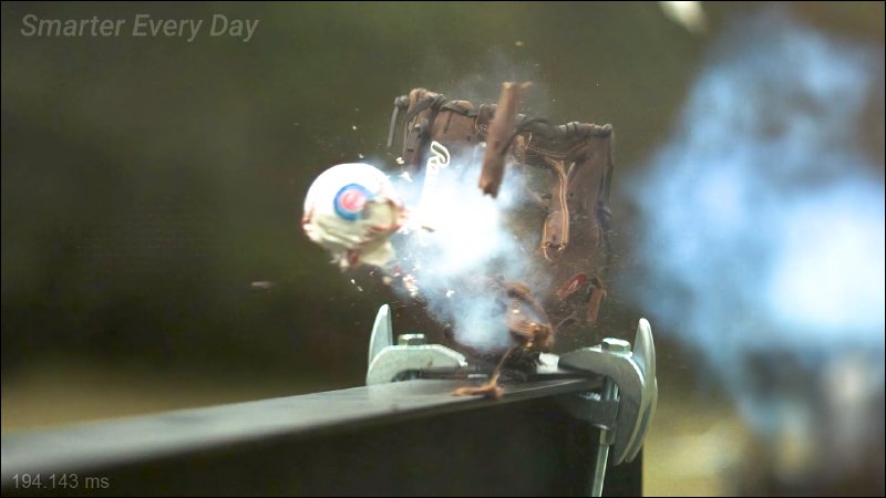 用超慢動作攝影機捕捉棒球射出的過程,可以看到棒球直接從假人胸前打穿過去:
