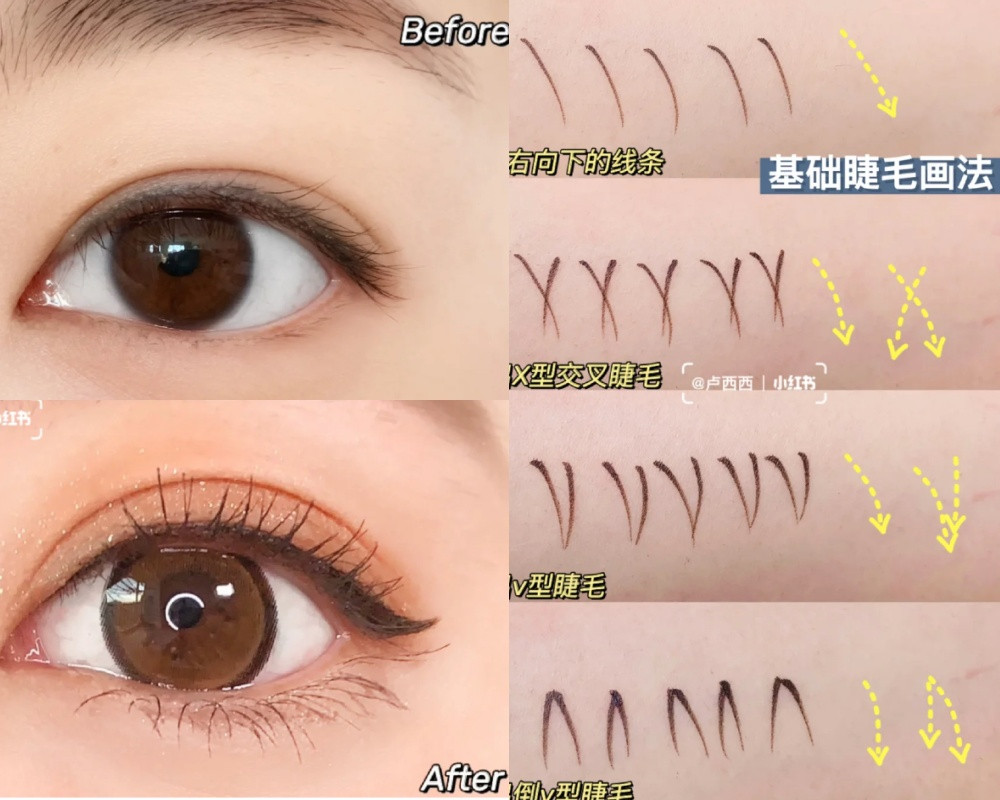 首先想要畫出好看自然的下睫毛,一定要先認識下睫毛的毛流生長方向~最常見的的下睫毛就是向斜下長,另外還有X型的交叉下睫毛、V型下睫毛,跟倒V型下睫毛。雖然只要畫斜向下的線條就可以讓睫毛變多,但是想要看起來更濃密、更自然的下睫毛,搭配其他三種毛流走向,畫起來效果會更好!