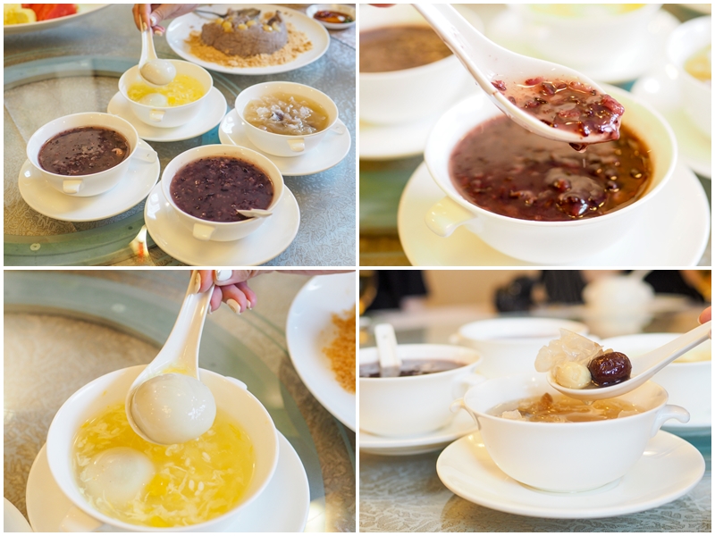 三種甜湯各有特色,特別是珍珠露用了芋泥、椰漿和紅豆沙,順口又濃郁,酒釀甜湯圓內餡則是芝麻口味