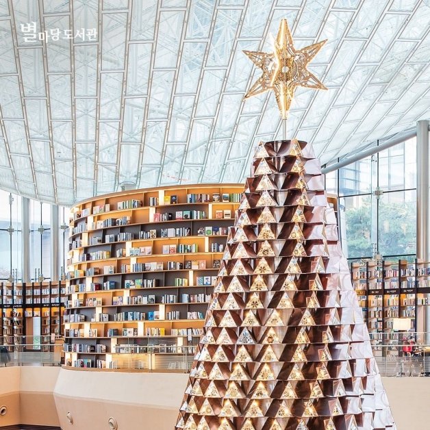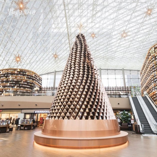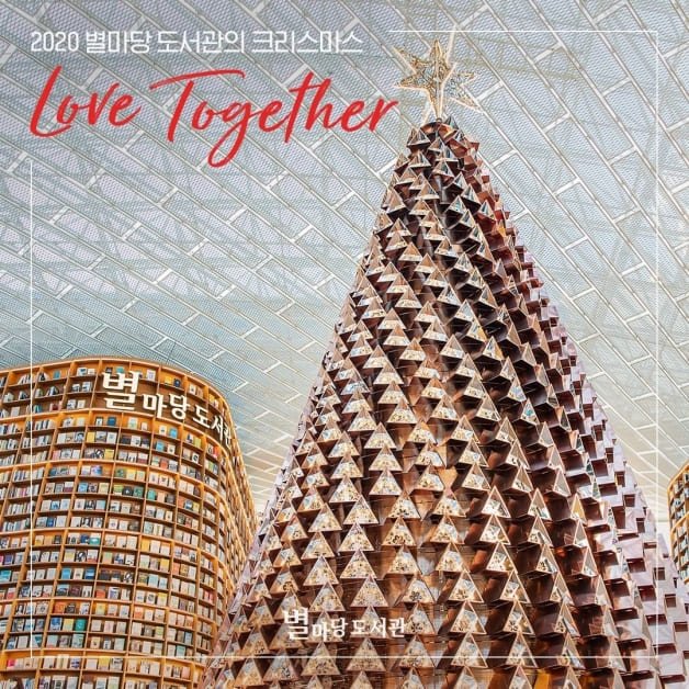 星空圖書館正中央的裝置藝術每年都會隨著節慶而進行更換,隨著聖誕節的到來,他們也擺上聖誕樹並以耶誕裝飾進行點妝,以「Love Together」為概念,使用900個燈飾,象徵集結「希望」的雪花,巨大的書架、挑高的設計加上燈光的照明之下,讓圖書館看起來宛如星空般!